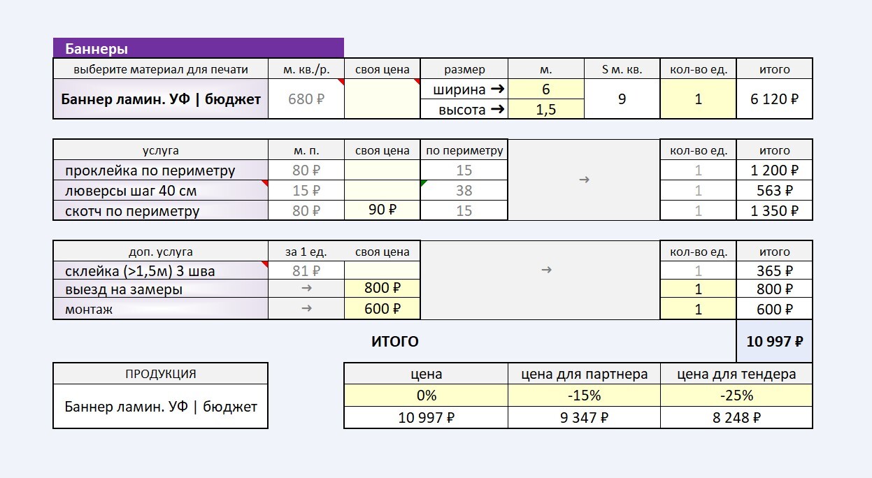 ⚡ В полной версии — более 200 позиций, автоматический подсчёт люверсов, склейки, фрезеровки и многое другое.